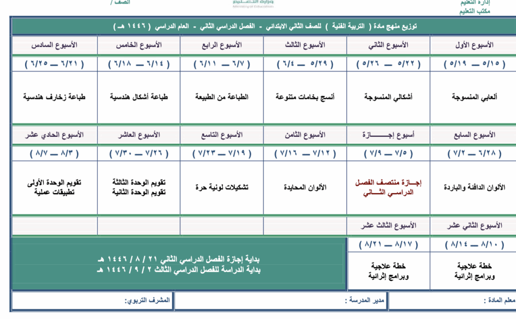 توزيع منهج التربية الفنية ثاني ابتدائي الفصل الثاني 1447